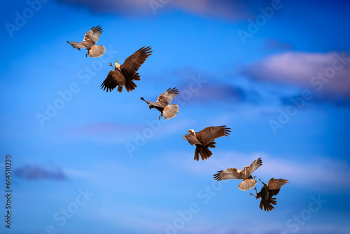 War of birds of prey. Cloudy sky background. It was created by combining three photographs taken by serial shooting. Western Marsh Harrier.