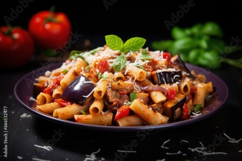Italian dish with eggplant tomato cheese and basil Pasta alla Norma