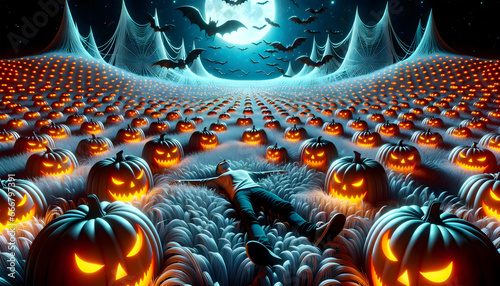 Halloween, dyniowe pole z mężczyzną, noc, księżyc i nietoperze, pająki i ogromne pajęczyny