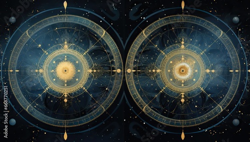 Astrological signs and ornaments around two glowing circles on a dark cosmic background. Abstract background and wallpaper.