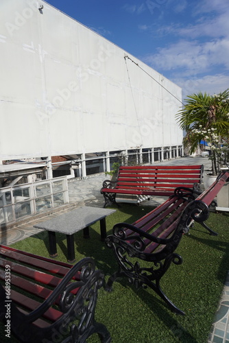 Park Bench Tranquility: A peaceful outdoor scene features meticulously arranged benches, offering a serene space for repose beneath the open sky, inviting contemplation in a calm outdoor environment.