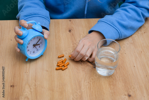 Brać lekarstwo, zegar pokazuje godzinę 3