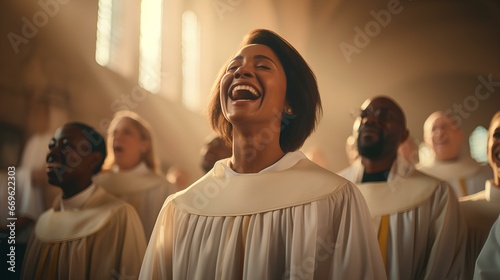 a church choir singing hymn with joy, showcasing the power of music in worship. generative AI