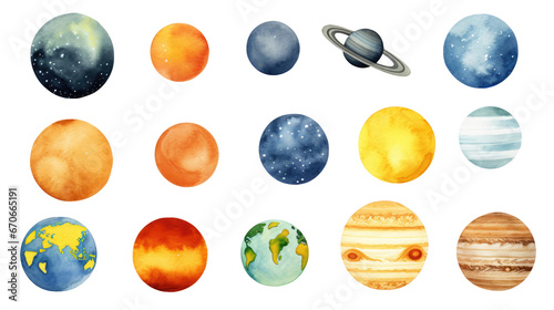 Watercolor illustration planet galaxy universe solar system stars set clipart sketch Mercury Venus Earth Mars Jupiter Saturn Uranus Neptune transparent background generative AI