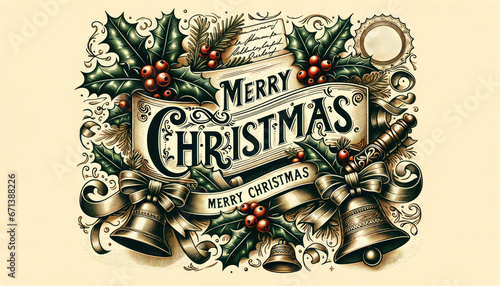 Ornate Typography of "Merry Christmas" on Vintage Postcard with Classic Festive Motifs