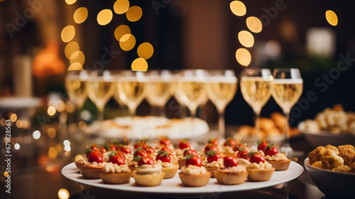 An array of mini appetizers and canapés for a chic New Year's Eve, Happy New Year dinner, blurred background, with copy space