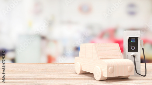 Ev station and wood car on Table for Technology concept 3d rendering