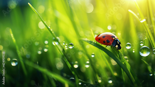 Young fresh green gras plant and ladybug on nature in spring summer meadow wiht water drops, droplets close-up of macro
