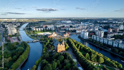 Kaliningrad city aerial view. Cathedral on Immanuel Kant Island, top view. Fishing village