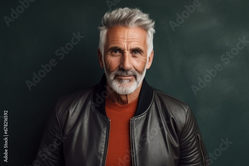 Portrait of a satisfied man in his 70s sporting a stylish varsity jacket against a empty modern loft background. AI Generation