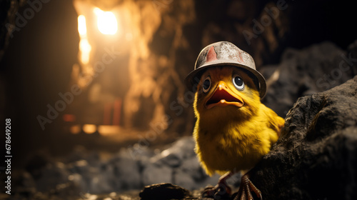 Terrified canary bird wearing miner's hard hat in standing in mine shaft, canary in the coal mine idiom concept