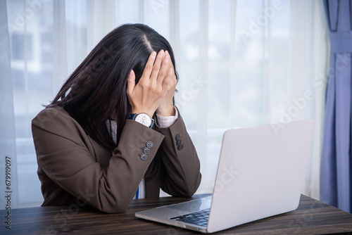 #862890624Asian businesswoman sitting in the office feeling tired, stressed or exhausted from a long day at work.