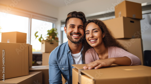 Cheerful young couple is surrounded by cardboard boxes, symbolizing a move to a new home