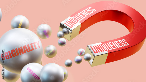 Uniqueness which brings Originality. A magnet metaphor in which uniqueness attracts multiple parts of originality. Cause and effect relation between uniqueness and originality.,3d illustration