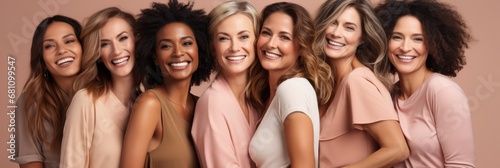 Womans day. Happy women of all ages and race together, smiling and hugging each other. Diversity