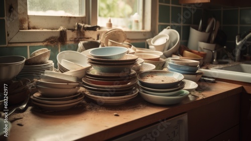 #1322556823Stacks of different clean plates near microwave on counter in kitchen