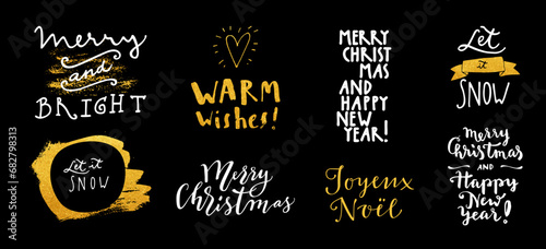 Merry Christmas, Merry and Bright, Warm Wishes vector set of hand lettered gold badges, quotes, emblems. Calligraphy card, gift tag, postcard, poster and T-shirt design Xmas golden isolated overlays
