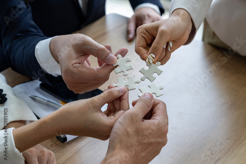 Close-up Hands Holding Jigsaw Puzzle, Teamwork Concept
