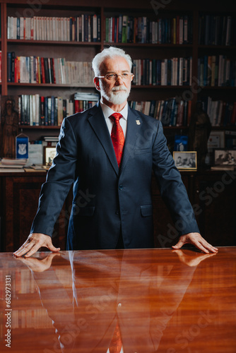 Experienced university rector in his 60s poses confidently in a library filled with books, representing the faculty and presidency of a reputable educational institution.