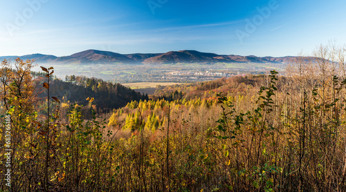 Trinec city with Moravskoslezske Beskydy mountains on the background in Czech republic during autumn morning