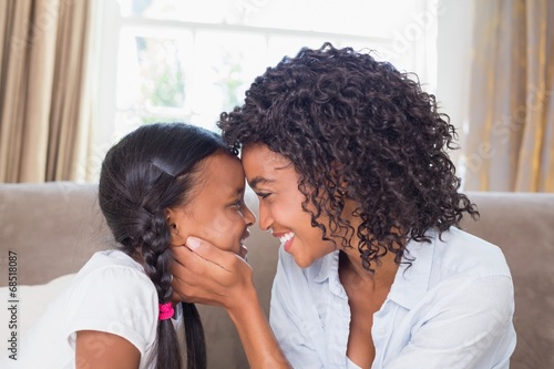 Pretty mother sitting on couch with cute daughter