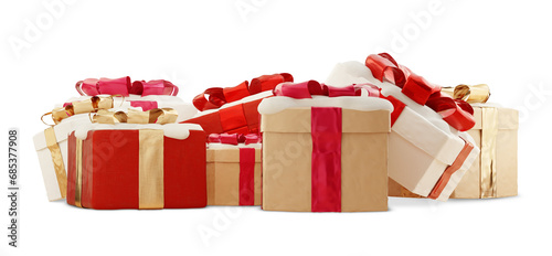 Christmas presents, snow on top, christmas gifts in row, red and golden wrapped, 3d-illustration