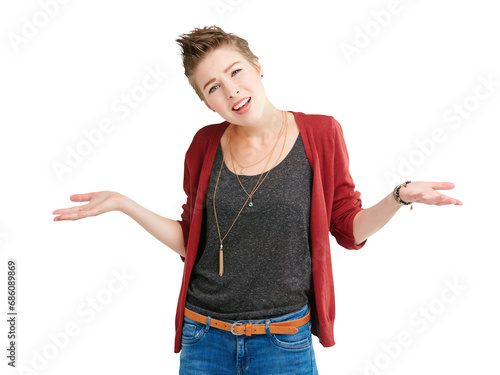 Isolated woman, open hand and confused in portrait for choice, options and review by transparent png background. Girl, fashion and why with palm for decision, doubt and questions in trendy clothes