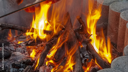 Płonące ognisko z suchych gałązek. Rodzinny piknik na łonie natury z pieczeniem kiełbasek. Ognisko rodzinne.