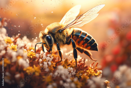 A bee pollinates flowers.Nature's Ballet: Bee and Bloom Harmony