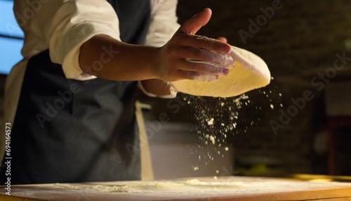 Pizzaiolo preparando a massa com o movimento de girar e lançar