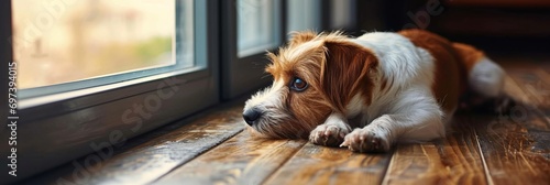 Cute dog on hind legs by window, waiting for ownerIndoor pet with blank space for text.