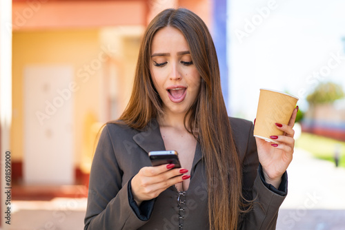 Young woman at outdoors using mobile phone and holding a coffee with surprised expression