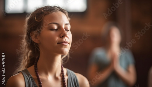 Young woman meditating, focusing on wellbeing and relaxation, serene and confident generated by AI