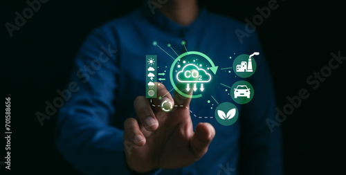 Greenhouse gas carbon reduce CO2 emissions to limit global warming and climate change, green environment energy neutral decarbonize technology recycle pollution, electric transport, offset planting.