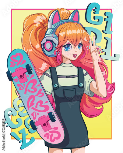 Anime girl hold on skateboard with graffiti hearts print. Fashion girl wear headphones with cat ears. Japanese woman. Skateboarder teenager girl