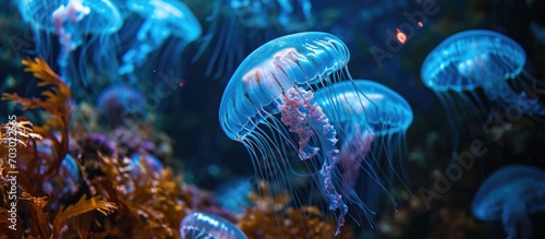 Oceanic bioluminescent jellyfish display its natural glow in an underwater aquarium environment.