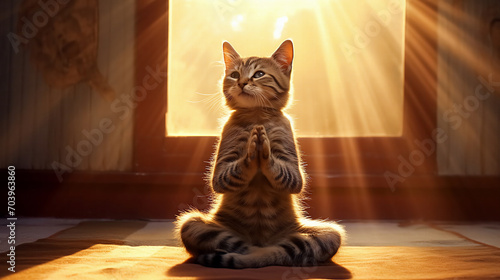The cat sits in the lotus position and makes namaste with its paws.