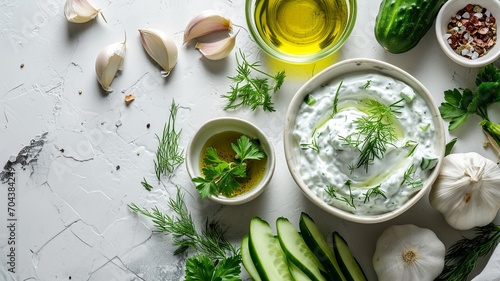 Greek Tzatziki Ingredients on White Ceramic Surface