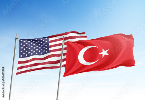 United states of america (Usa) and Turkey flags waving in the dawn sky Nato