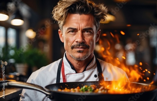 Realistic illustration of a professional chef in kitchen, preparing and presenting a dish of food.