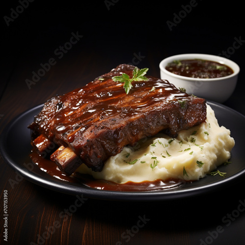 fotografia con detalle de plato con costillas a la brasa, puré de patata y salsa barbacoa