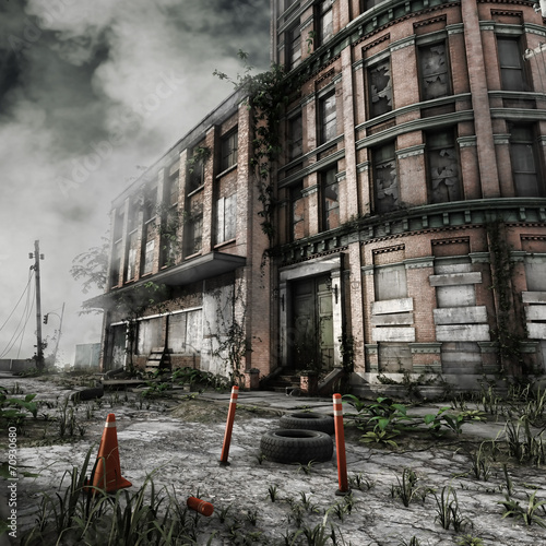 Opuszczony budynek miejski z zarośniętym trawą podwórzem