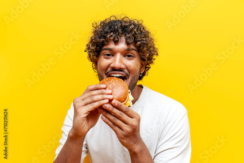 young hungry indian guy eating delicious cheeseburger on yellow isolated background, curly man eating fast food and biting burger