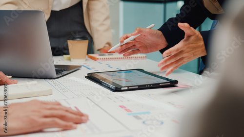 Closeup happy young Asia businesspeople meeting brainstorming some new ideas about project to his partner working together planning success strategy enjoy teamwork in small modern home office.