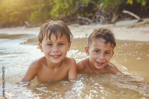Two young boys are playing in the water and smiling