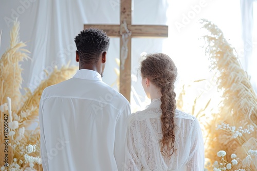 Back of couple in white clothes getting married on the cross of Jesus.