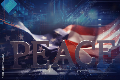 Double exposure Peace Word and abstract technology background. International conflict, American hegemony, War.