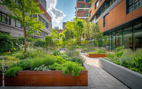An urban courtyard transformed into a green sanctuary, emphasizing the positive impact of incorporating nature into city spaces