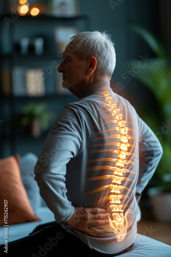 Homme sénior assis dans son salon sur sa banquette qui a mal au dos, avec sa colonne vertébrale en surbrillance lumineuse. Montage numérique anatomie humaine