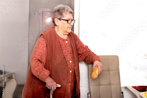 A sweet grandmother with a stick waits for breakfast with a loaf of bread in her hand at a nursing home. Nutrition for the elderly, diet in old age, getting help
